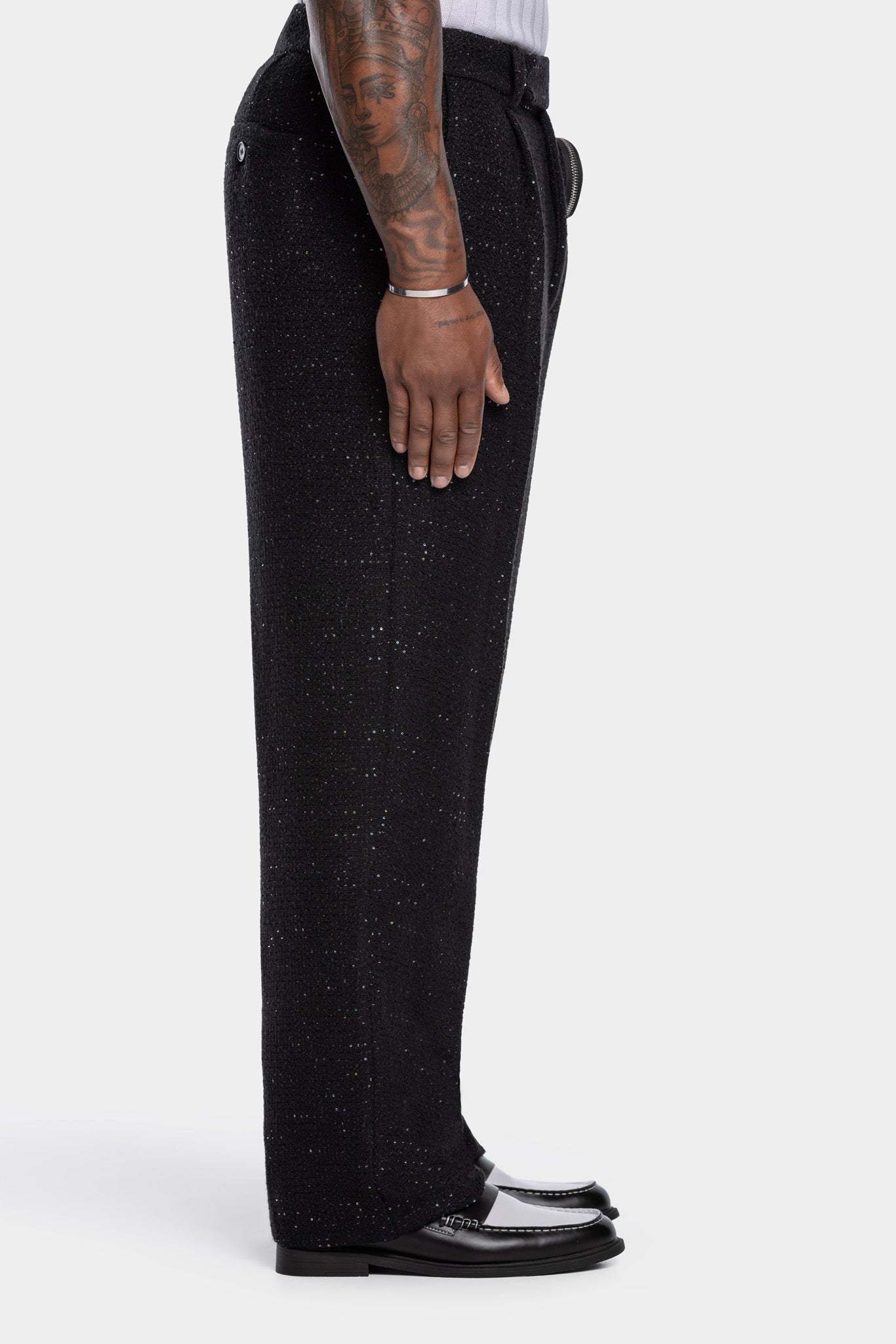 The statement pleated pants with refined elegance. Crafted from a luxurious striking fabric with a detachable pouch on waist. Finished with light shimmer-embellished detail.