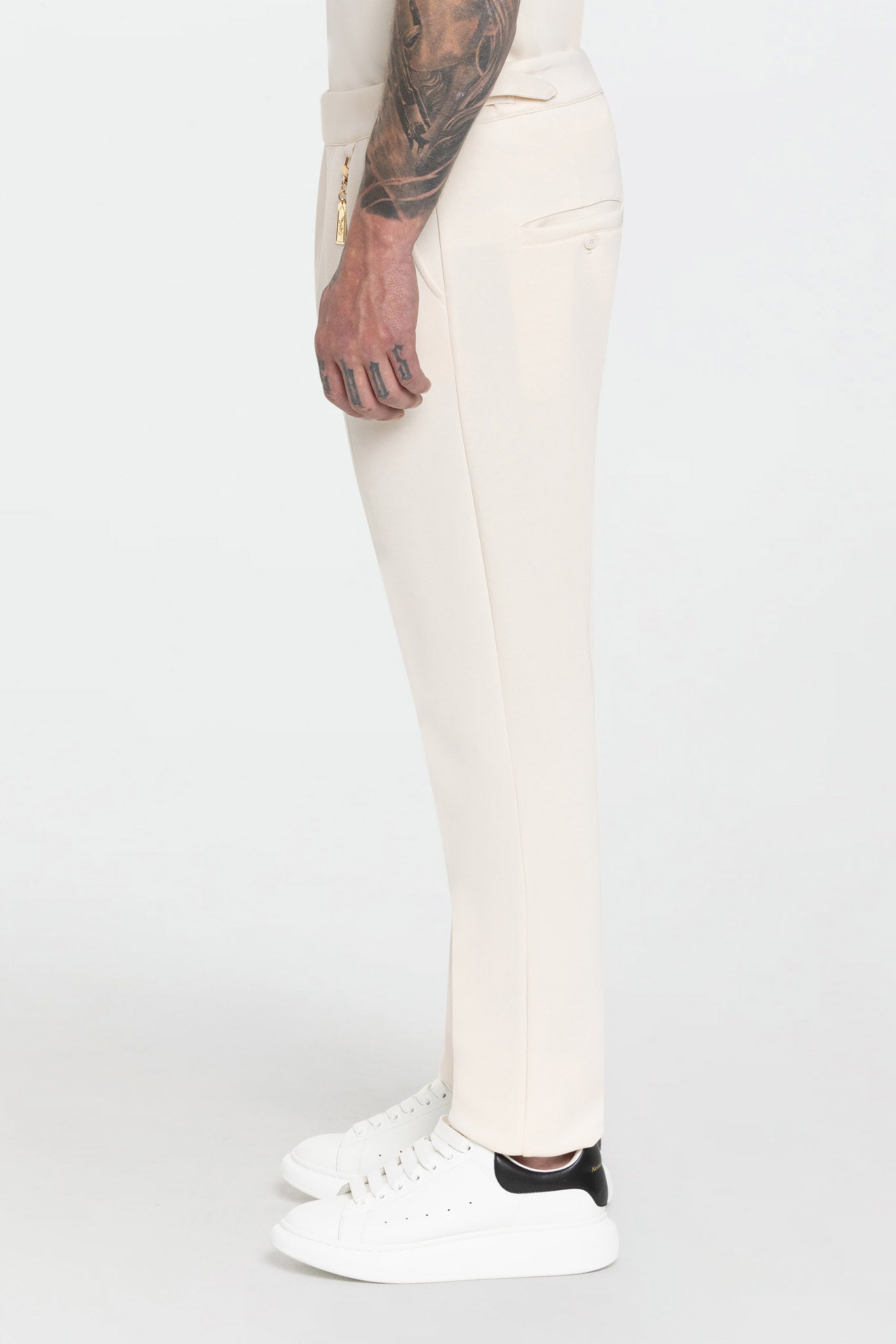 Stretch Cotton Pleated Pants With Side Adjusters & Detachable Gold L’BOUGE Swing Plaque On Waist In Ivory